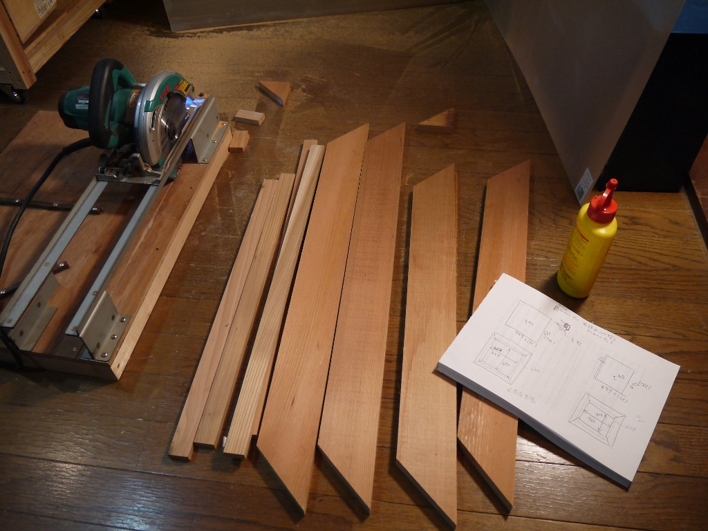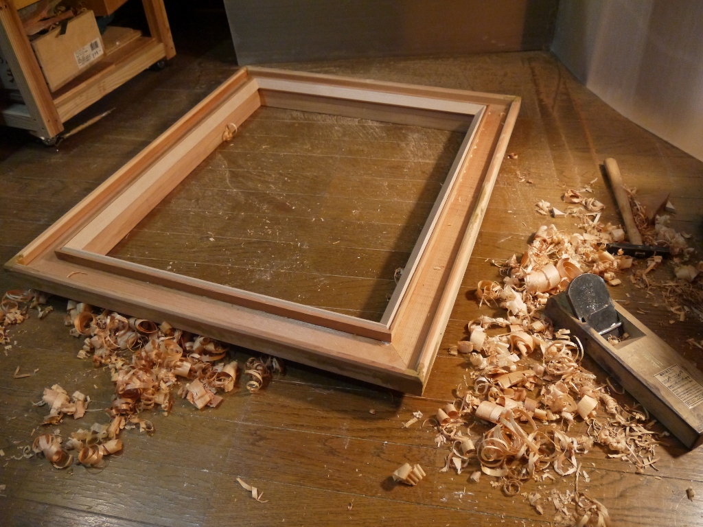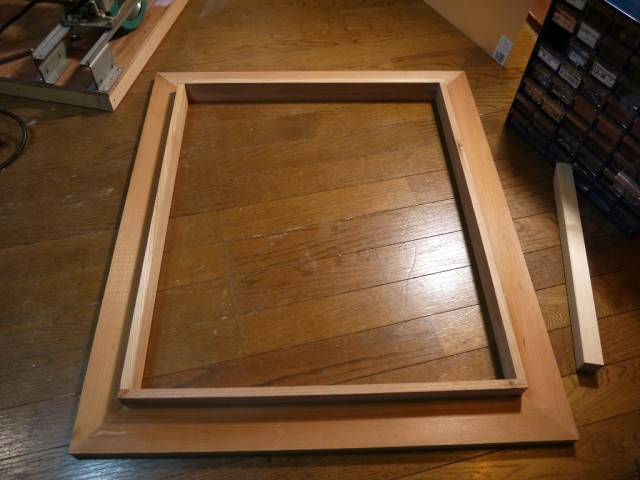 下がその流れです。木材を絵の大きさに合うように45度にカットし、張り合わせていきます。